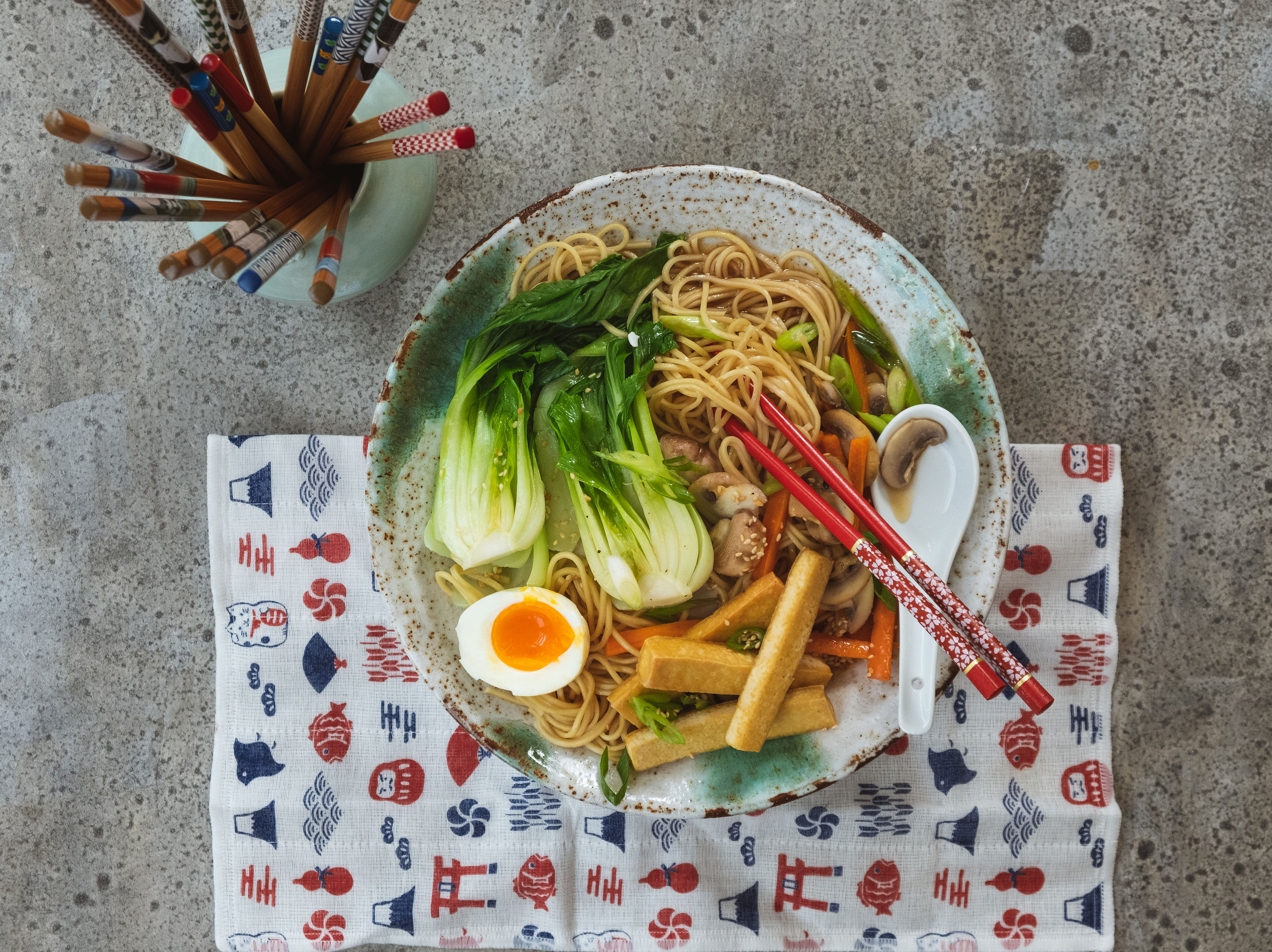 270 gram packet of ramen noodles 240 grams firm tofu, cut into cubes or sticks Vegetable oil to fry tofu 6 cups water 1 teaspoon vegetable stock powder 2 tablespoons of Tamari or soy sauce 1 tablespoon rice vinegar 1 tablespoon mirin 2 tablespoons white miso 1 tablespoon brown sugar Green spring onions 1 carrot julienned 1 bunch bok choy washed and cut into halves 12 button mushrooms or fresh shiitake sliced thinly 2 eggs boiled (omit for Vegan)
