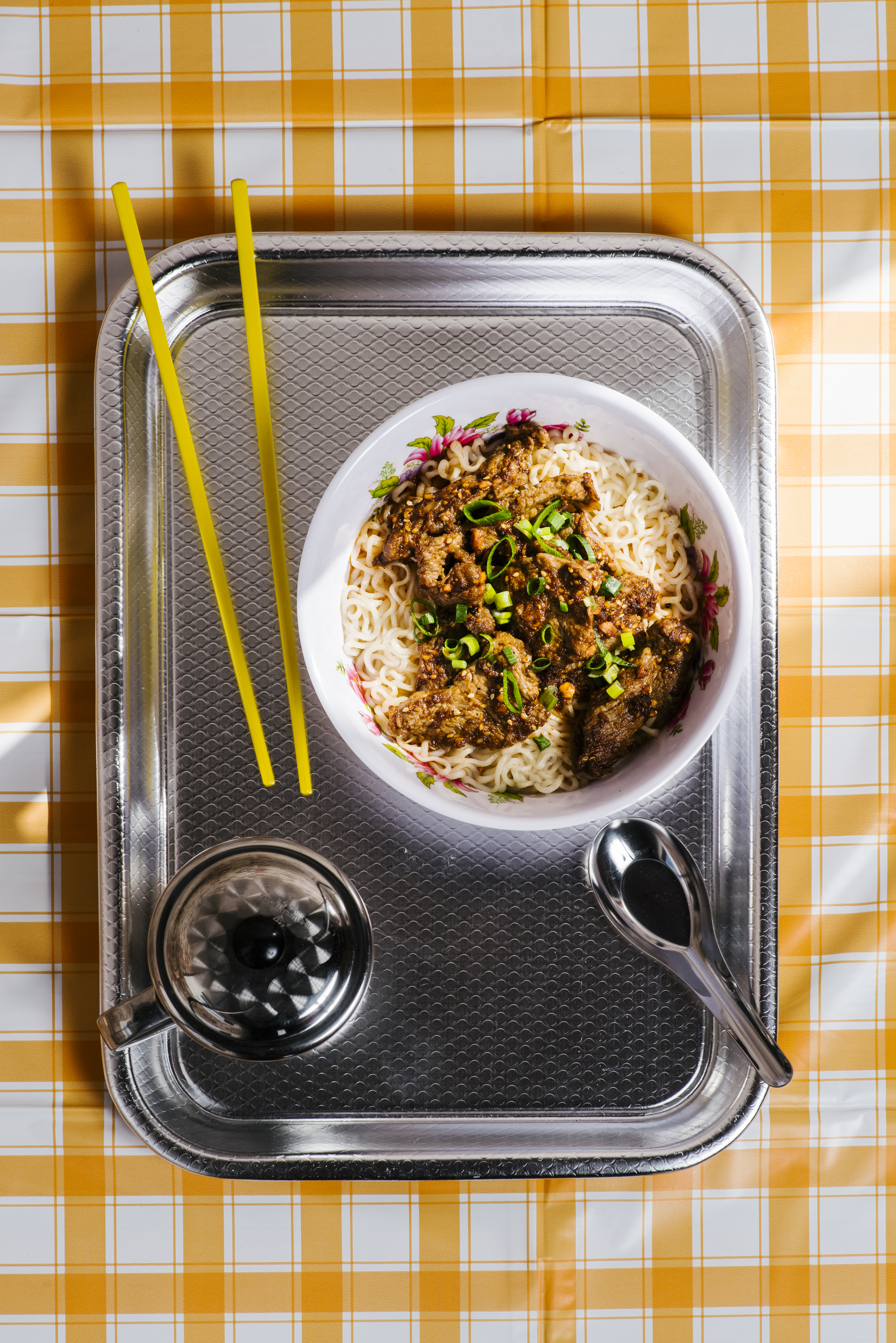 Divide the noodles among serving bowls and top with the beef and sauce. Sprinkle with spring onion and sesame seeds and serve.