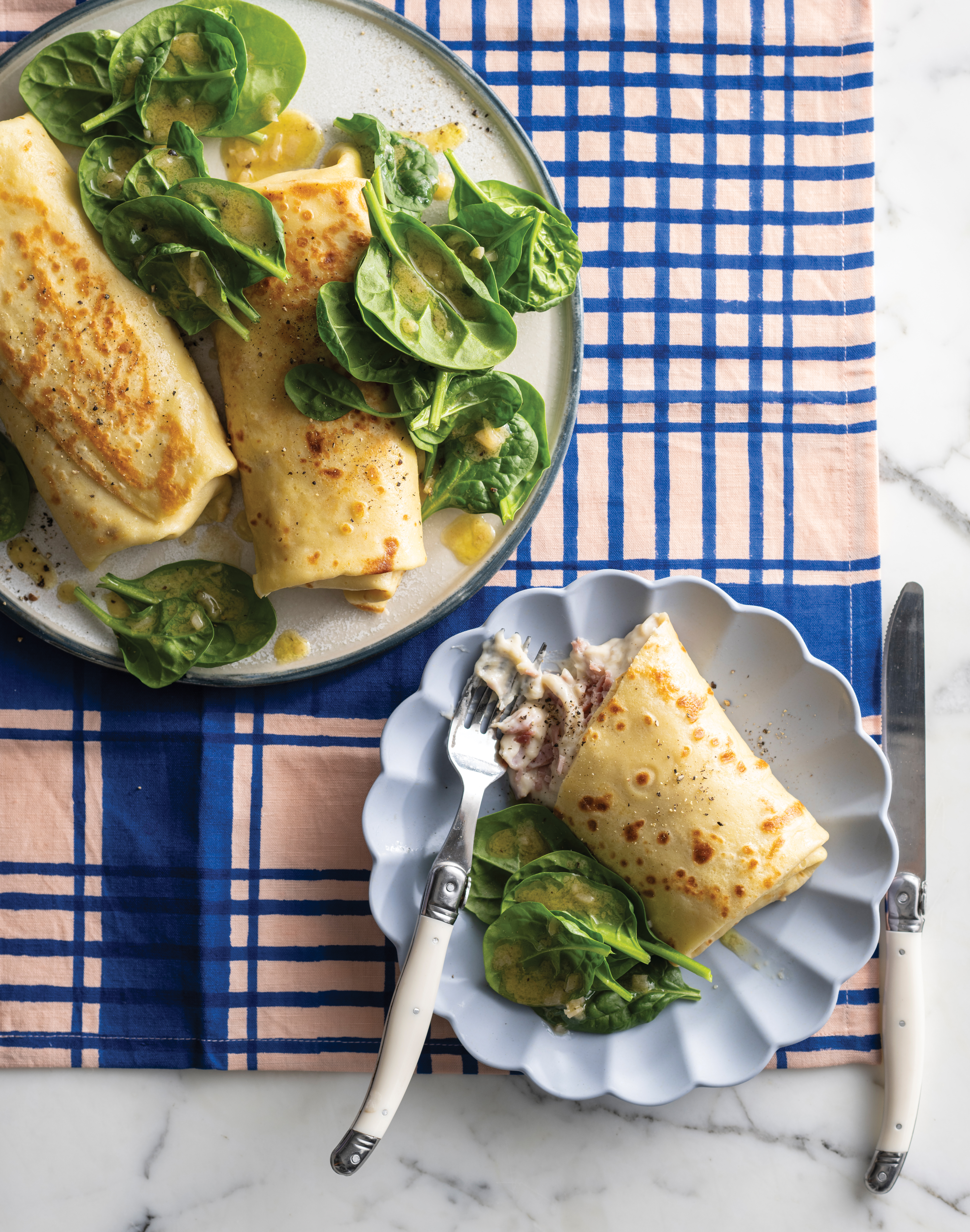 This recipe takes me back to childhood! We always had a few stuffed crêpes in the freezer for quick, lazy dinners. My brother and I loved them – we simply couldn’t resist the creamy, cheesy delights. For a vegetarian option, try replacing the ham with cooked mushrooms.