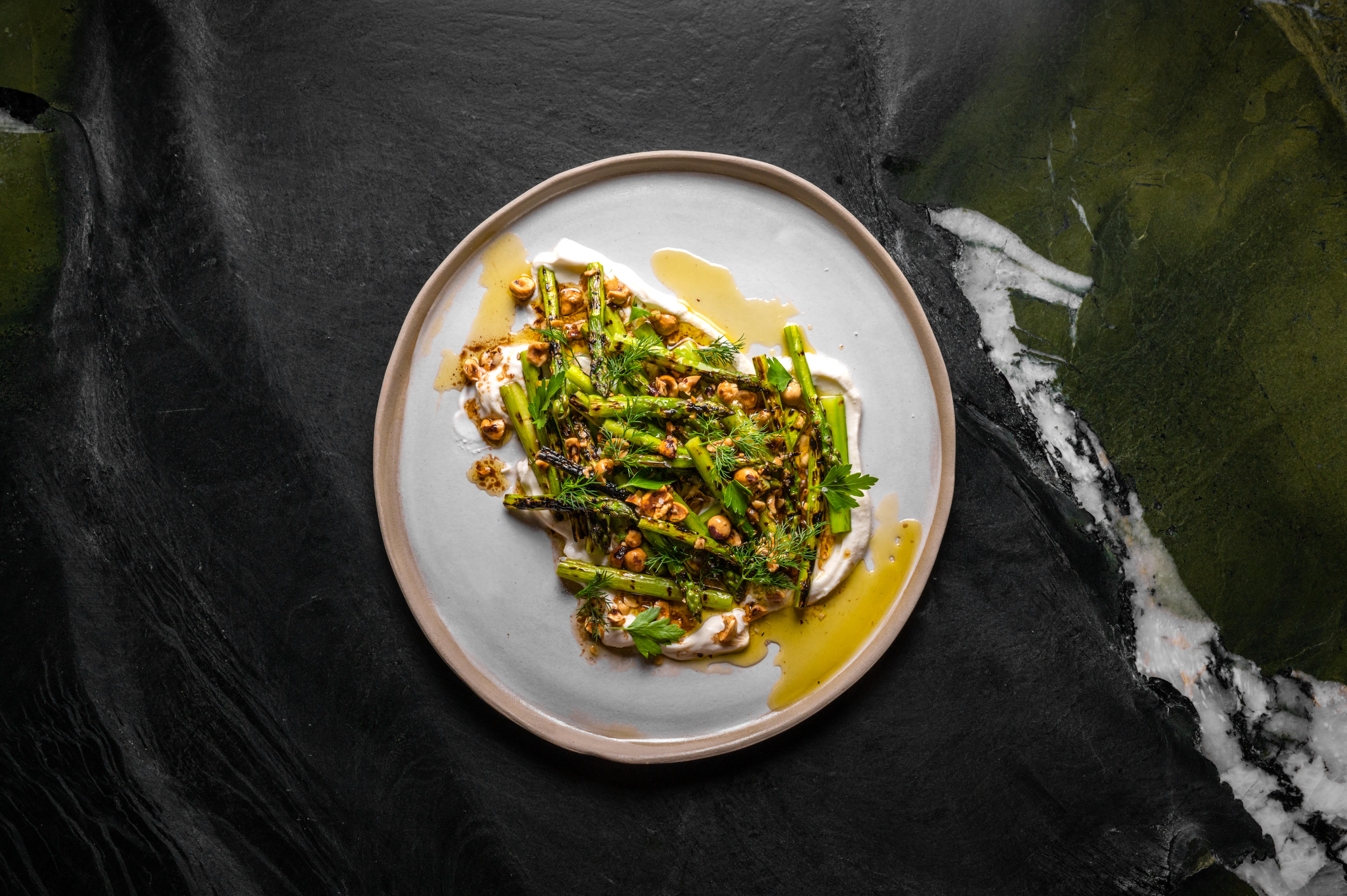 To plate: Spoon the Greek yogurt generously on the base of each plate. Arrange the grilled asparagus on top, then spoon over a generous amount of the hazelnut vinaigrette. Finish with a sprinkle of fresh dill and serve with a lemon cheek on the side for a bright, zesty touch.
