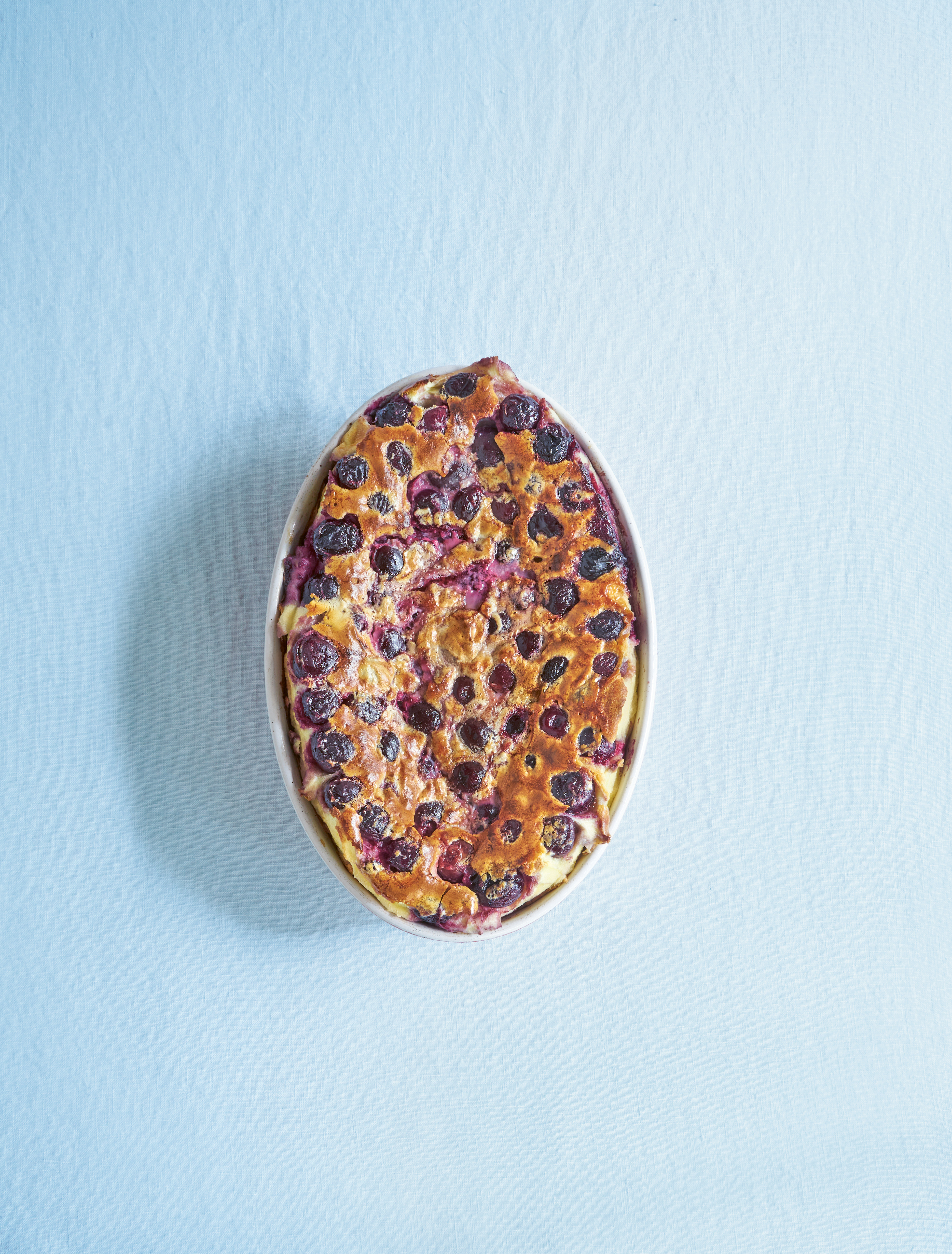 Clafoutis is a pudding from the region of Limousin, in south-central France, but variants exist in neighboring regions. There is a debate in France on whether to pit (stone) the fruit or not: some say it’s best not to because the stones yield a lot of extra taste and the cherry juices won’t be lost in the pudding; but it’s easier to eat the dish without. Clafoutis batter is a little like a pancake batter, which is poured over fruit and then baked. Cherries are the most classic flavor, but other fruits work well too, such as Mirabelle prunes, raspberries, or pan-fried slices of apples.