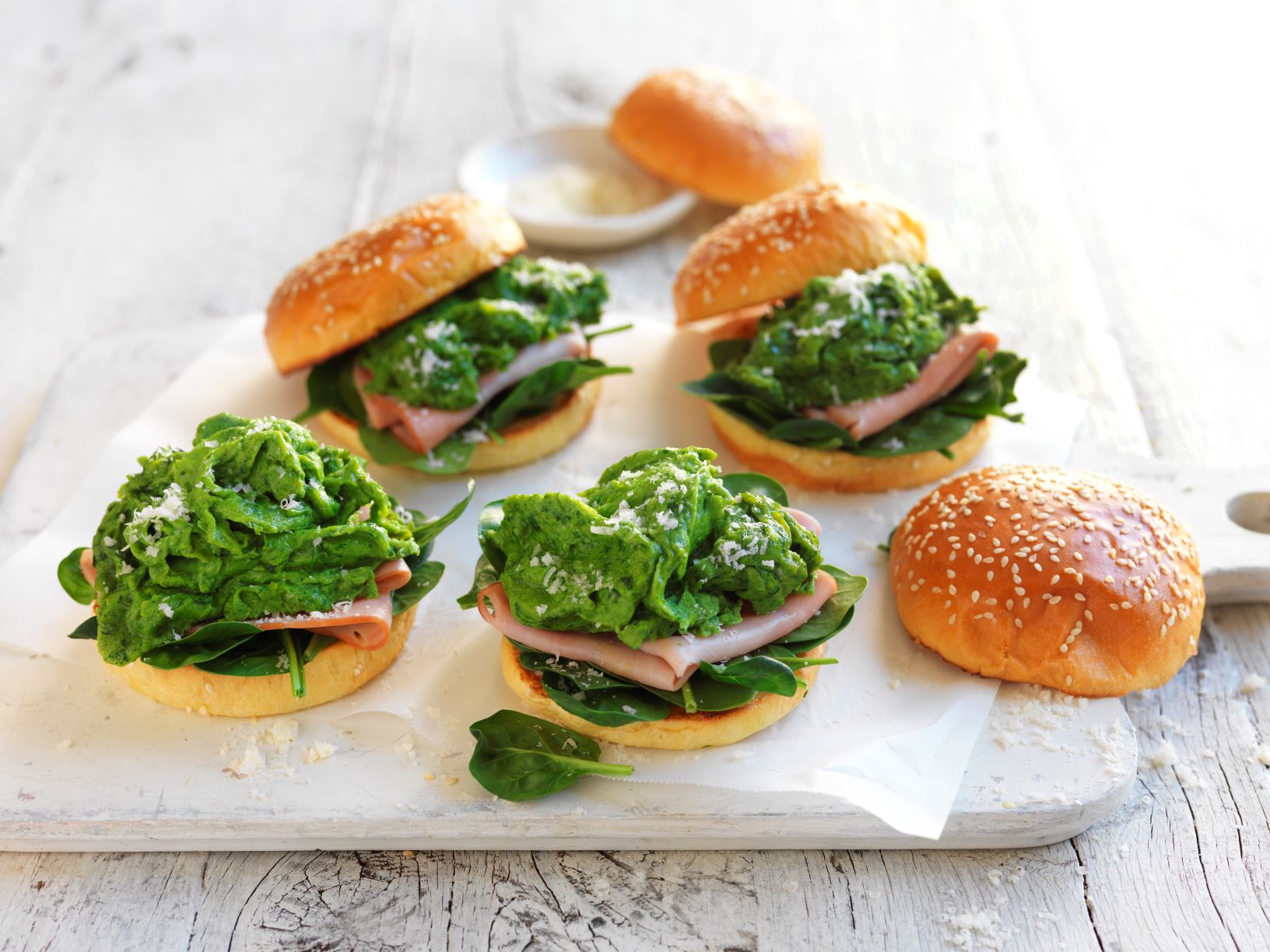 Top bun base with spinach leaves, ham and green eggs. Sprinkle with parmesan, top with bun lids to serve.