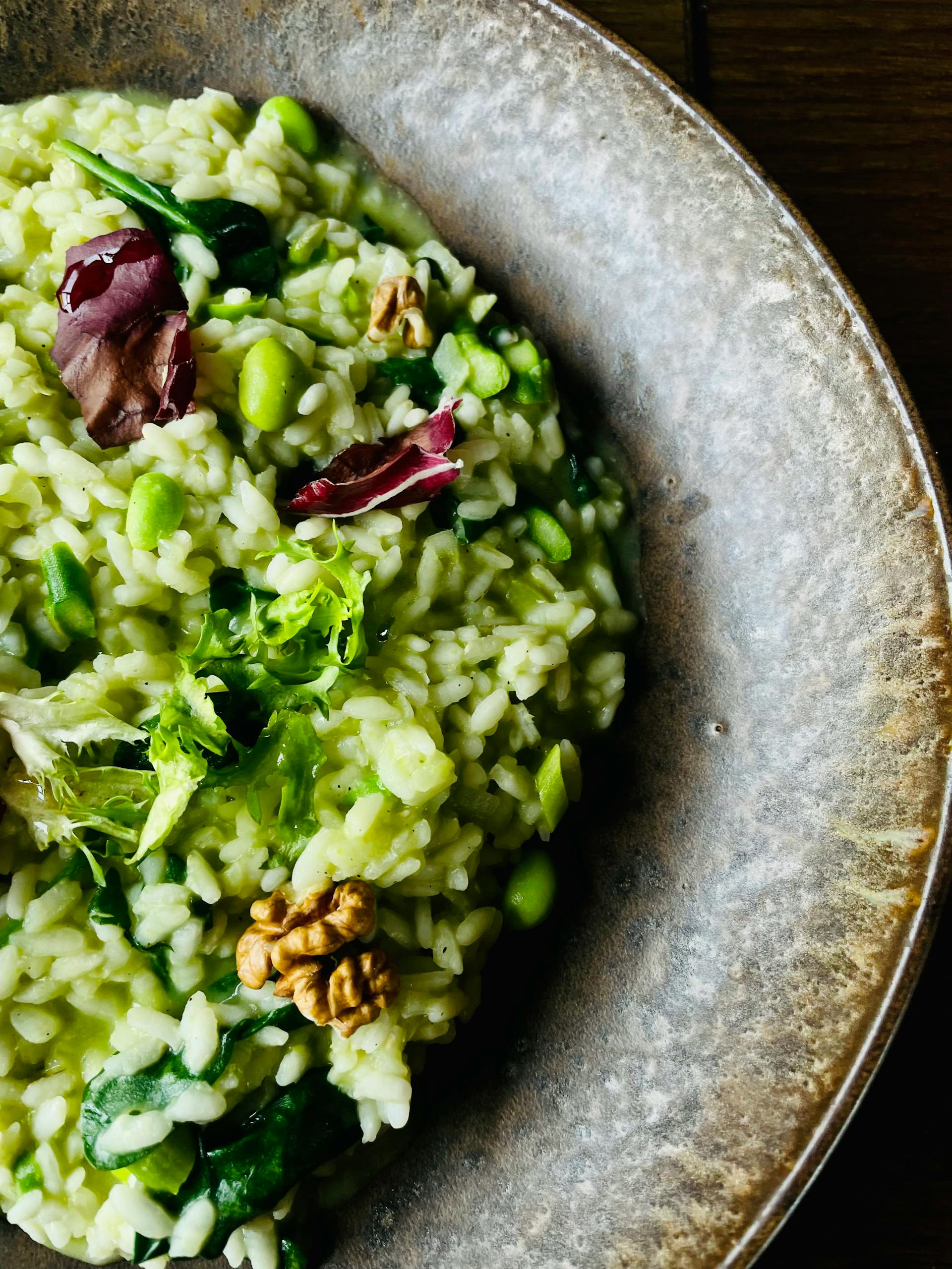 This Green Risotto is earthy, zesty, and texturally rich from the walnuts, just the thing for a cozy night in or a spring dinner party centrepiece.