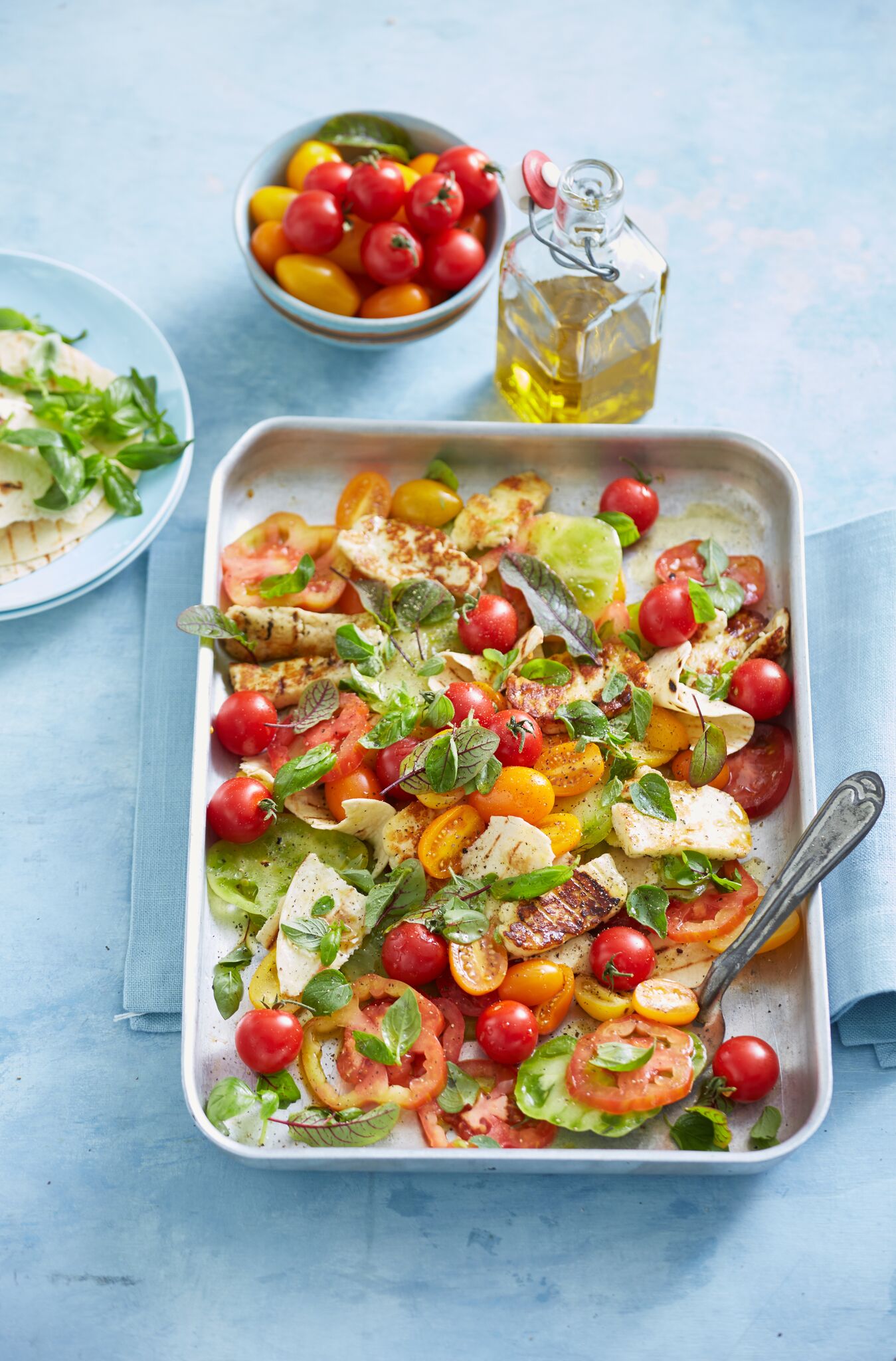 Bring a touch of Mediterranean flair to your table with this vibrant Haloumi, Tomato, and Flatbread Salad. This recipe effortlessly combines the salty, creamy texture of grilled haloumi with the juicy sweetness of assorted tomatoes and the crispness of lightly charred flatbread. Dressed simply with white wine vinegar and a quality Cobram Estate extra virgin olive oil, this salad is a symphony of fresh and comforting flavors. The addition of fragrant herbs like oregano and basil, along with peppery baby beetroot leaves, rounds out this dish, making it a colorful and healthful choice for any meal. Perfect for a quick lunch or as a side at your next barbecue, this salad is as delightful to look at as it is to eat. Follow these simple steps to create a dish that’s sure to impress with its bold flavors and textures.