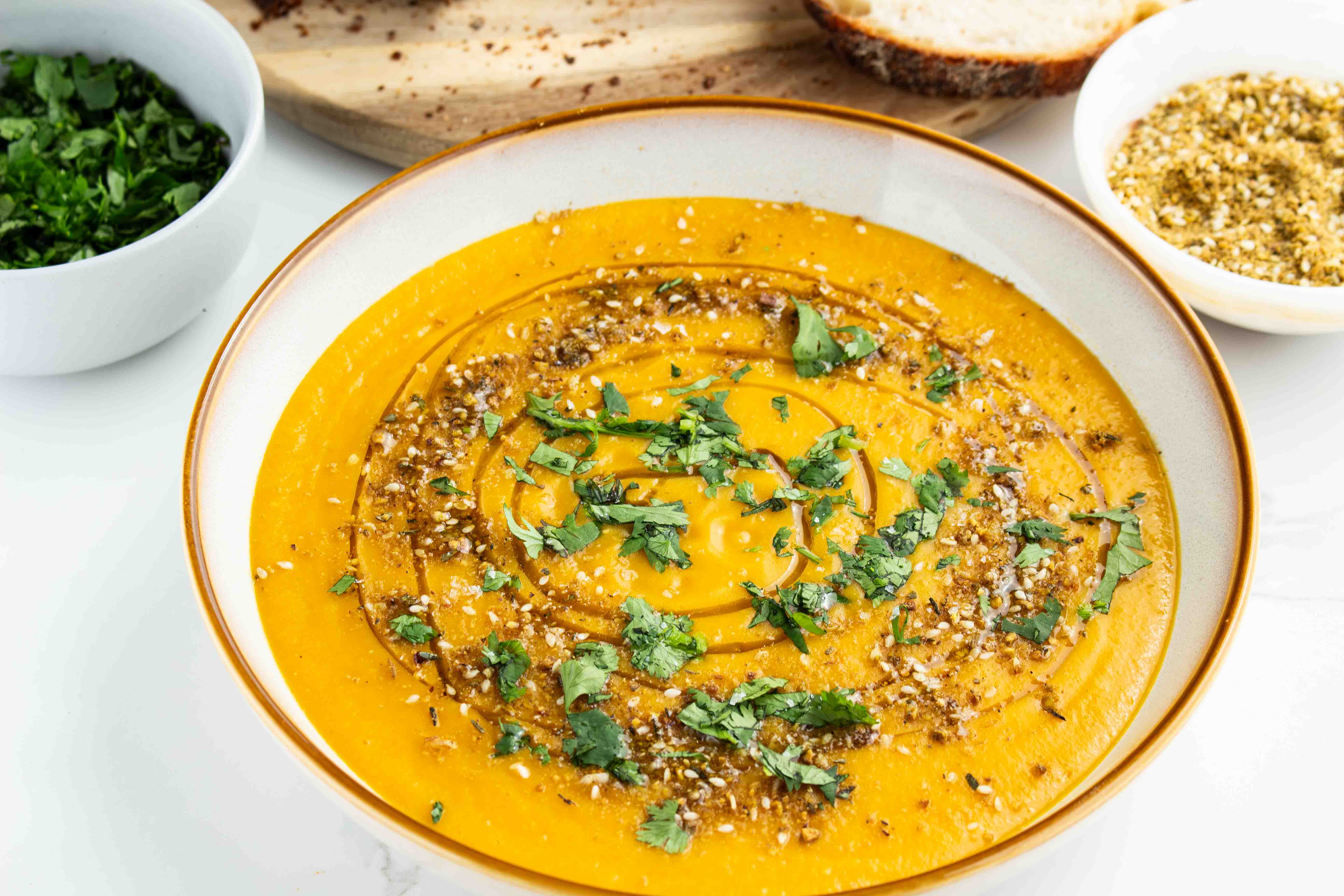 Simply delicious, this warming soup proves you don’t need complicated ingredients to make a truly flavorsome dish. Pumpkins are bursting with beta-carotene, whilst the lentils provide a good source of fibre and protein. Top with dukkah and serve with crunchy toasted sourdough (or bread of choice) to complete this rustic meal.