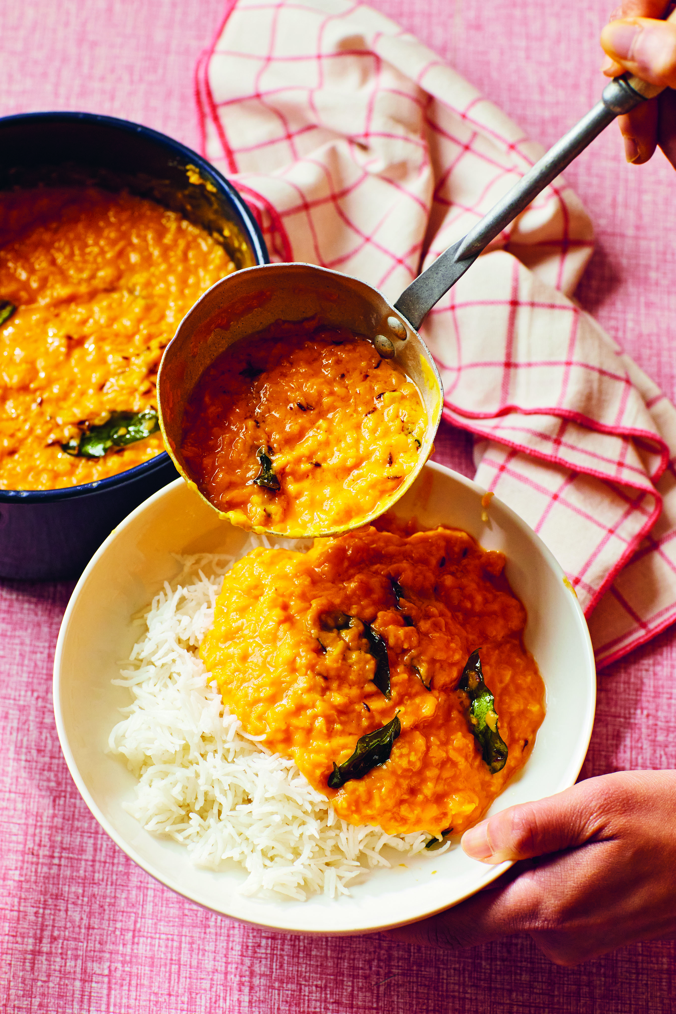 There is a street of casual open-air restaurants, just 10 minutes’ walk away from my family home. Among them are two competing Mamak hawkers. I would go to the one that was open earlier on Sundays for breakfast and the one that shut later after a night out for supper. Whatever the time of the day, I would order roti prata, wonderfully greasy and flaky ghee flatbread that you dunk into a thin, spicy curry. It was a simple curry, made with lentils, curry leaves and maybe a few bits of tomato, but I would mop up every drop. This dal is a take on that hot, spicy prata curry. I’ve used more coconut and lentils to turn it into a richer dish that’s perfect over plain steamed basmati rice.