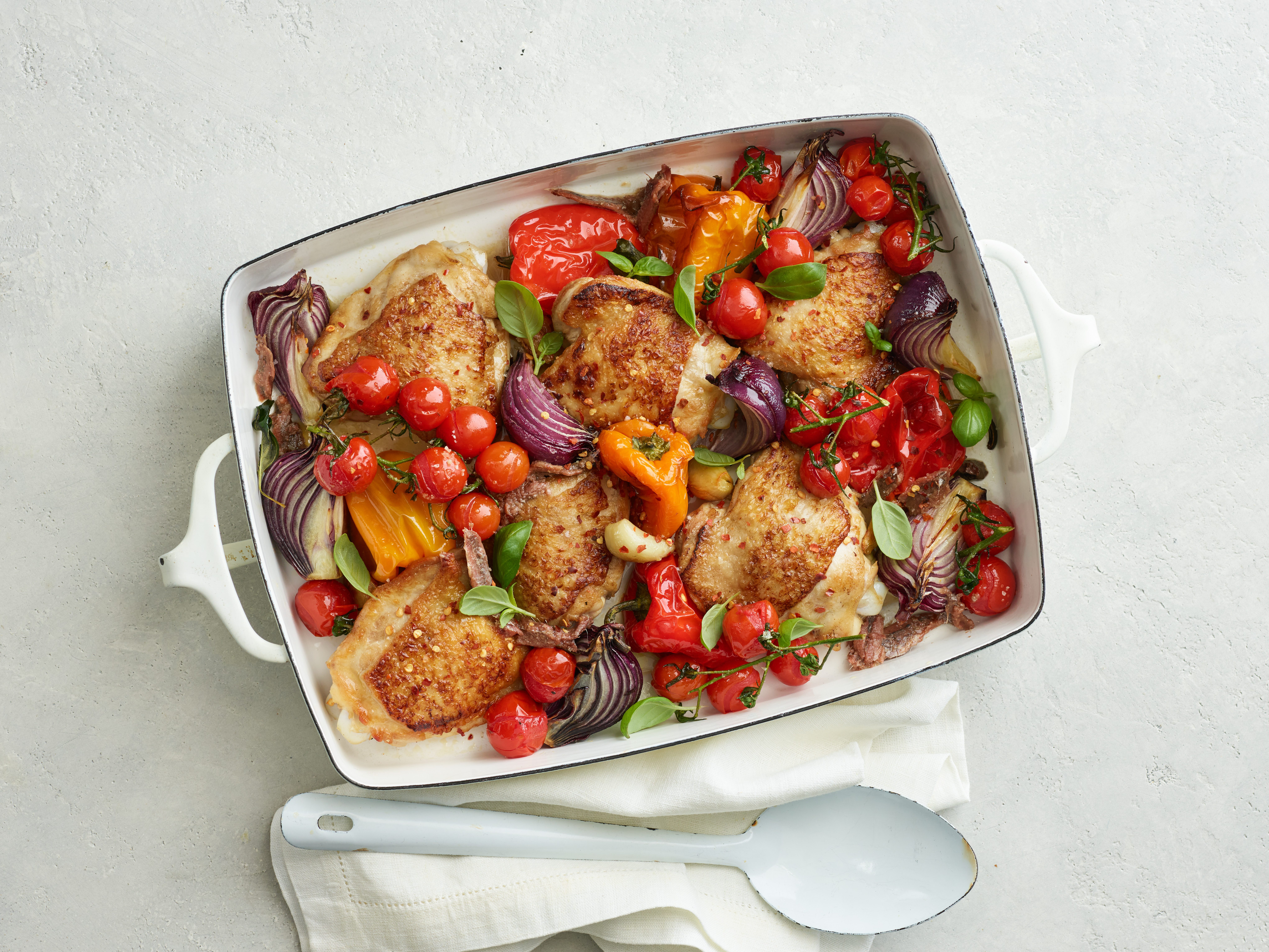 Discover the vibrant flavors of the Mediterranean with this simple yet delicious Mediterranean Chicken Tray Bake. This one-pan wonder is perfect for busy weeknights or when you need a flavorful meal without the fuss. Featuring juicy chicken thigh cutlets seasoned to perfection and roasted alongside sweet red onions, mini capsicums, and succulent cherry tomatoes, each ingredient melds beautifully under a generous drizzle of rich Cobram Estate extra virgin olive oil. Finished with fresh basil, this dish is a celebration of fresh ingredients and robust flavors that will transport your taste buds to the sunny coasts of the Mediterranean. Follow these easy steps to create a meal that’s both nourishing and delightfully satisfying.