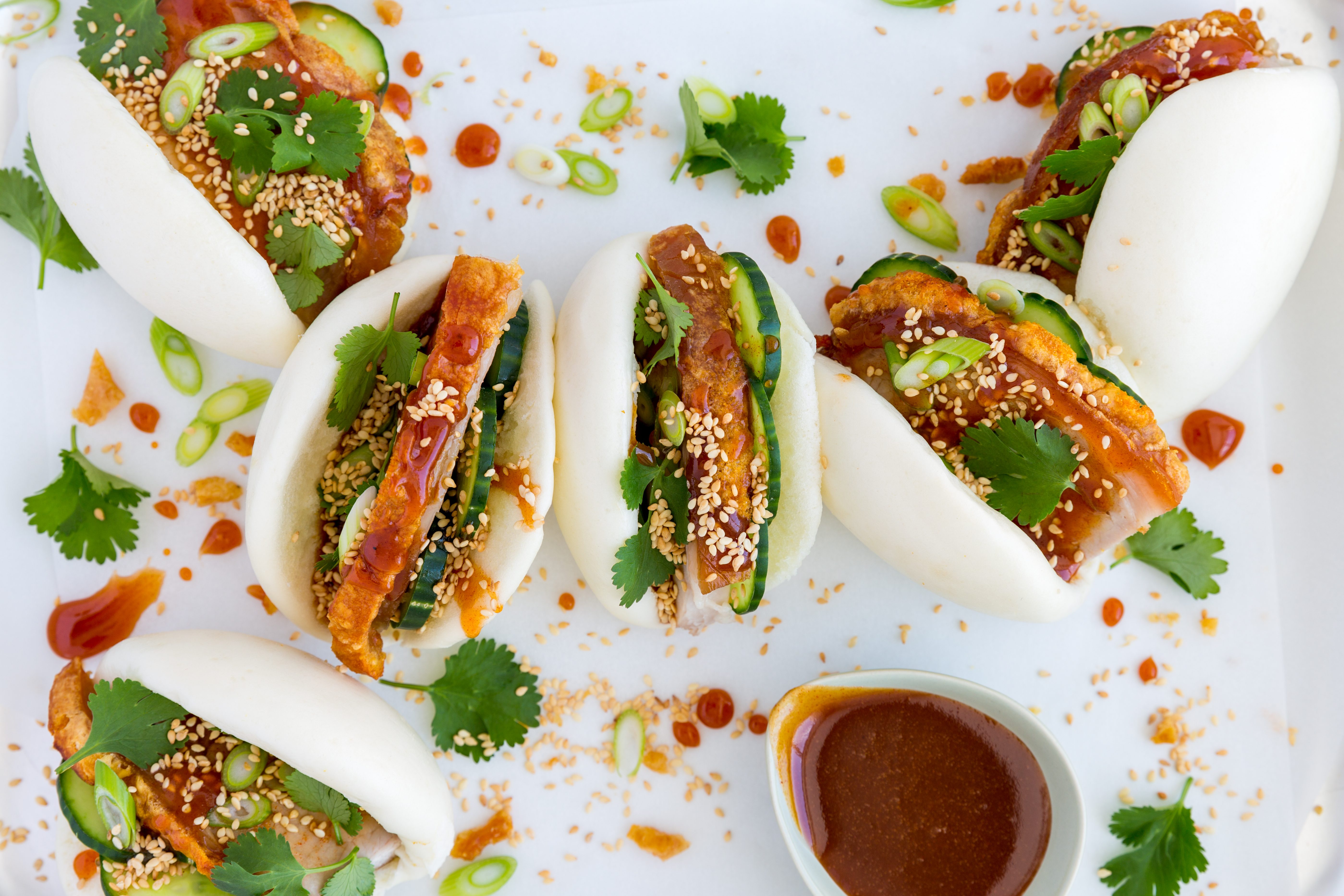 To assemble, use your fingers to open bao buns up. Divide cucumber between buns and top with sliced pork. Spoon over maple glaze and top with coriander, spring onion and sesame seeds. Arrange bao onto a large platter and serve.