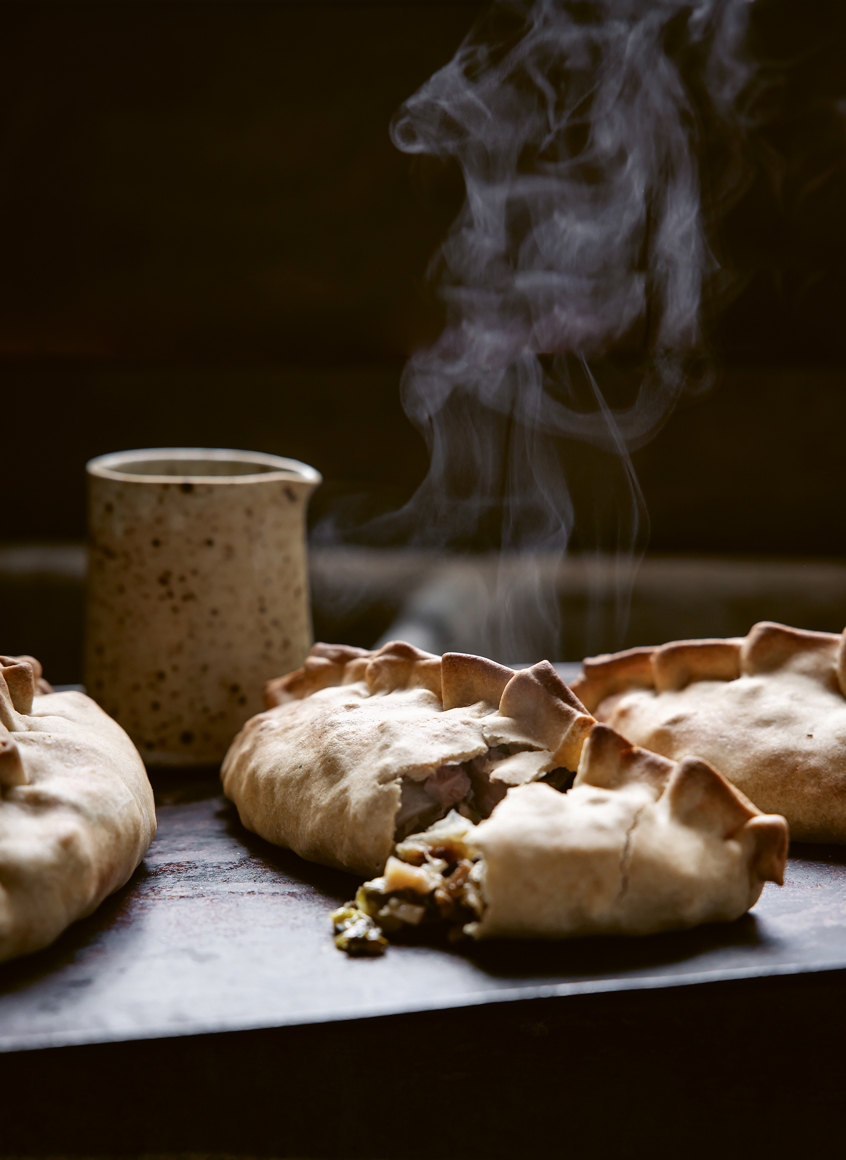 Using a rolling pin, roll one pastry piece out into a circle about 20 cm (8 in) in diameter. Place one-quarter of the filling mixture in a small mound along the centre line, tapering o. at each end. Use your fingers to wet the edges of the pastry. Pull the two sides over the filling and press together using your index finger and thumb, to concertina the join, working all the way around to each end. Finally, fold the very last piece of dough at each end over itself, to completely seal the pasty.