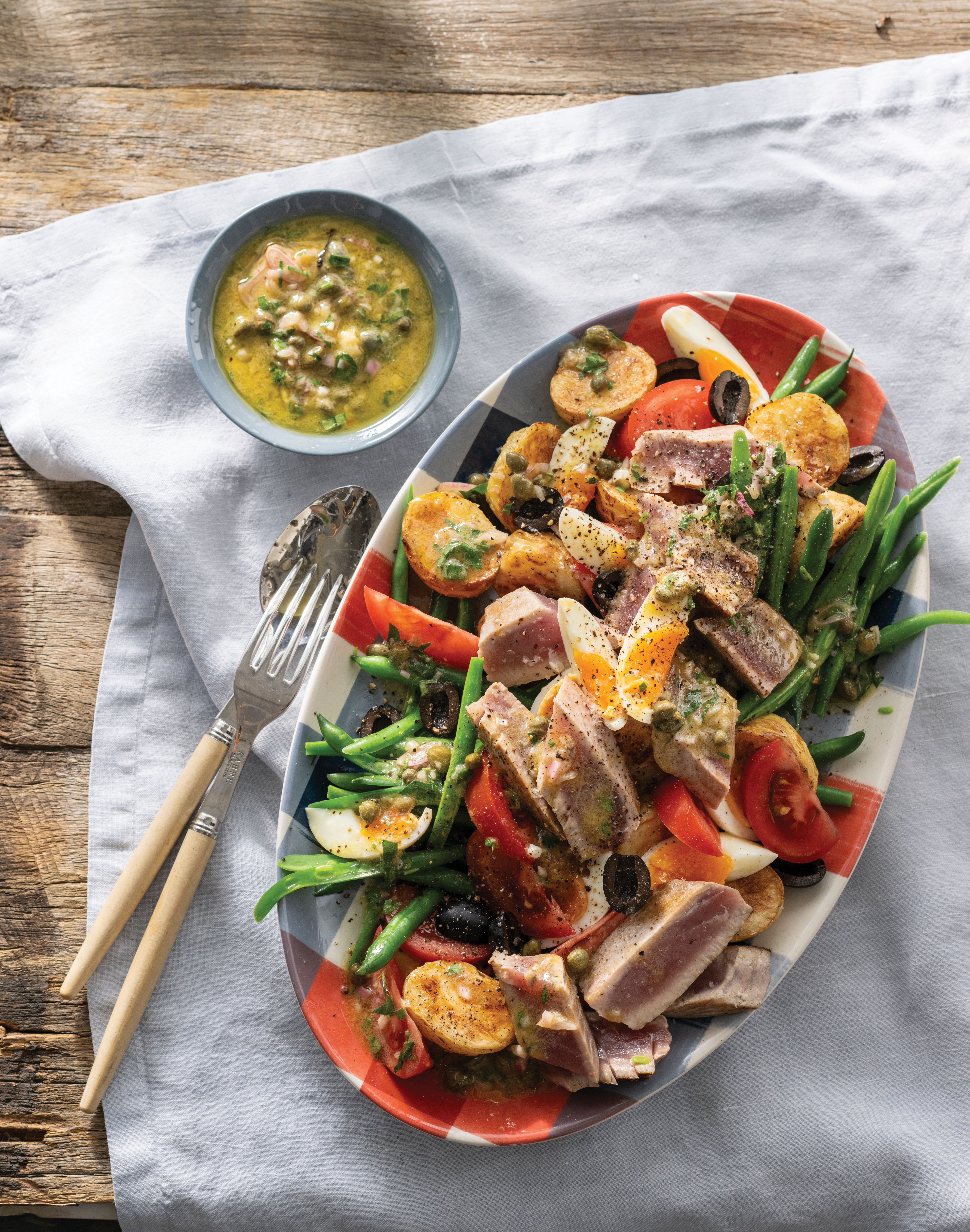 To assemble the salad, arrange the potato, green beans, tomato and olives on a large platter. Top with the egg halves and tuna slices. Drizzle with the dressing just before serving.