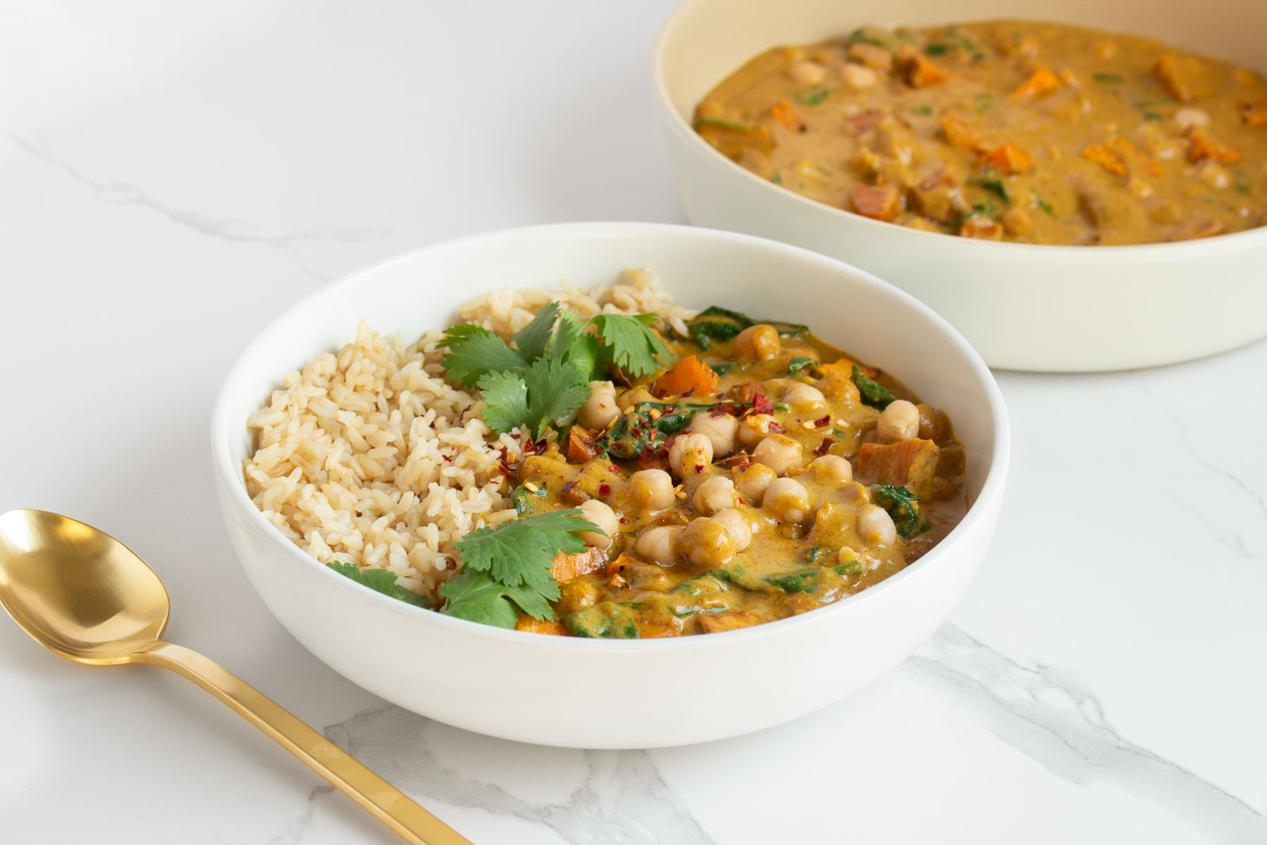 Add in the chickpeas and baby spinach, and continue to cook until the spinach is wilted. Stir through the cooked sweet potato. Season to taste with sea salt and black pepper. Serve with the brown rice, coriander leaves and chilli flakes, if using.